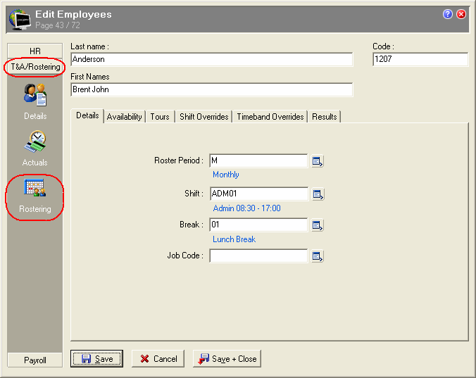 Employee rostering information is stored in the employee table. Navigate to each employee's T&A/Rostering | Rostering | Details tab to add or edit rostering information.