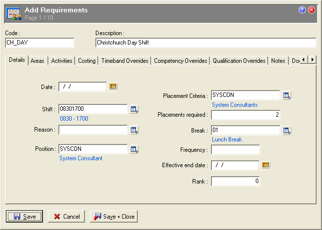 The following example shows a requirement for two System Consultants to work a day shift in Christchurch.